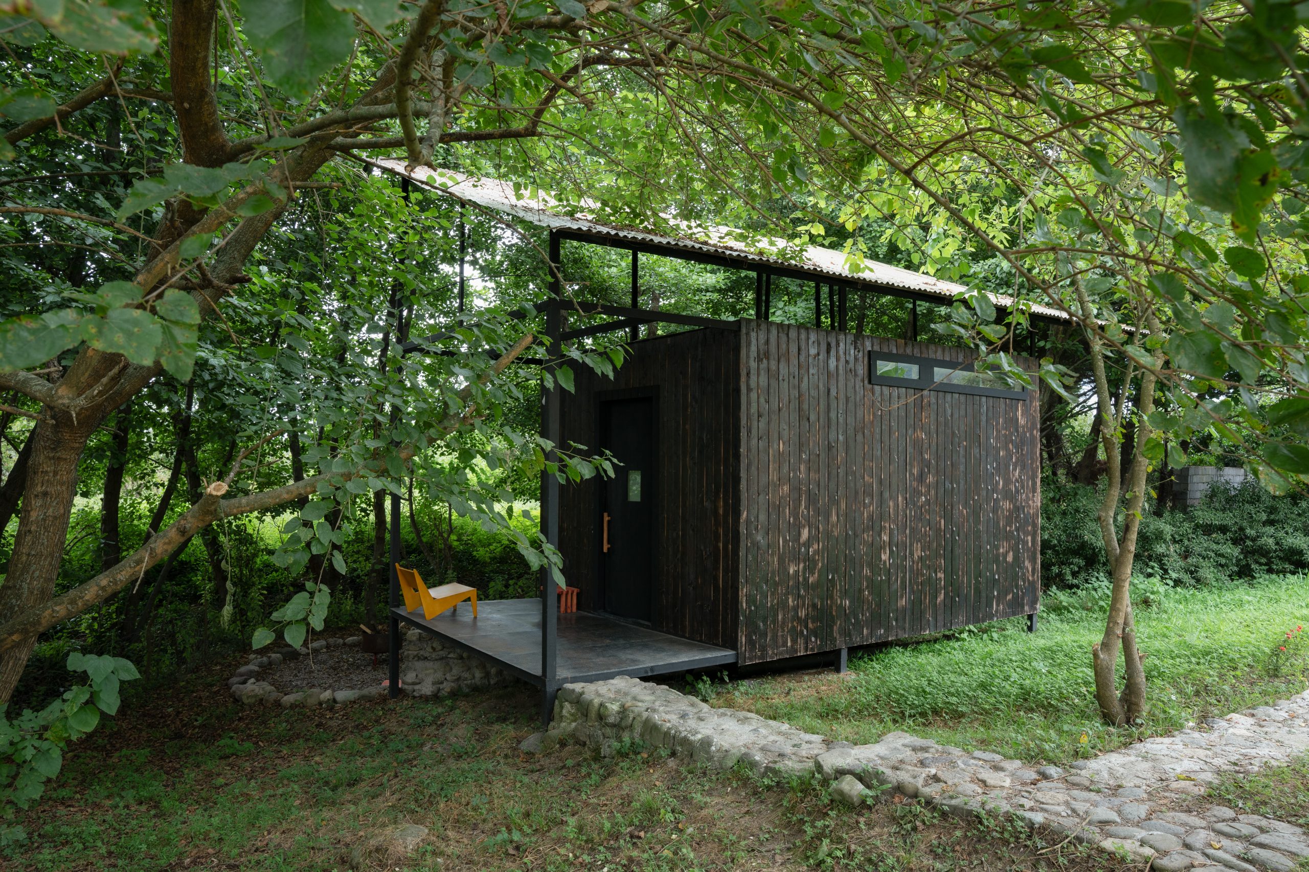 این پروژه در تلاش برای بازتعریف معنای کوخ در معماری امروز است. تضاد کاخ و کوخ نه تنها در جنبه سیاسی اجتماعی آن هاست، بلکه این تضاد در معمار آنها نیز شایسته تامل است. کوخ به معمنای اولیه ترین سرپناه برای حفظ انسان و زندگی از عناصر متخاصم طبیعی و غیر طبیعیست. با نگاهی از دریچه سمپر(معمار قرن ۱۹ آلمان)، طرح این پروژه از این سقف شروع شد. سادگی اجرا و استفاده از تکنیک های کهن غیر بومی در کنار سازه فلزی به عنوان راهکاری امروزی و قابلیت استفاده در حین ساخت و قبل از تکمیل نهایی از مهمترین شکل دهنده های این طرح است که از لحاظ اقتصادی اجرای این پروژه را ممکن نموده است. یک صفحه روشن معلق در میان درختان، به عنوان مستقیم ترین نمایش سقفی برای زندگی عنصر اصلی در طراحی این سازه است. سقفی روشن که توسط سازه فلزی تیره ای معلق است، سازه ای که در بطن خود جعبه ای سیاه و مرموز را بین زمین و سقف معلق نگه داشته است. که در این جعبه سیاه مرموز معلق، از زندگی و جریانش محافظت می شود.